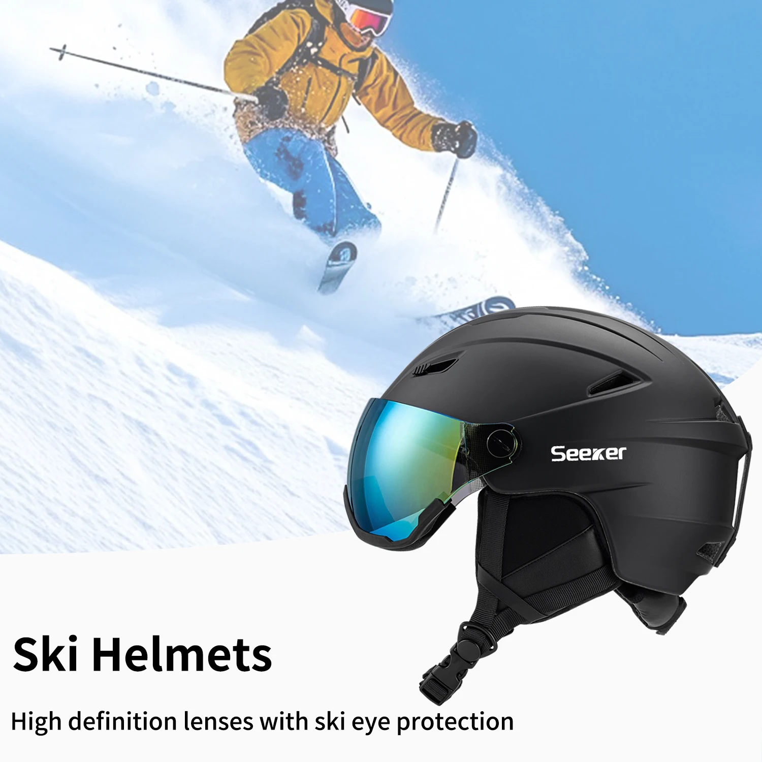The SEEKER Integrated Ski Helmet with Snow Goggles is designed to provide maximum protection, comfort, and visibility for winter sports enthusiasts. Featuring a built-in snow goggles design, this helmet eliminates the hassle of separate eyewear while ensuring a secure and comfortable fit.